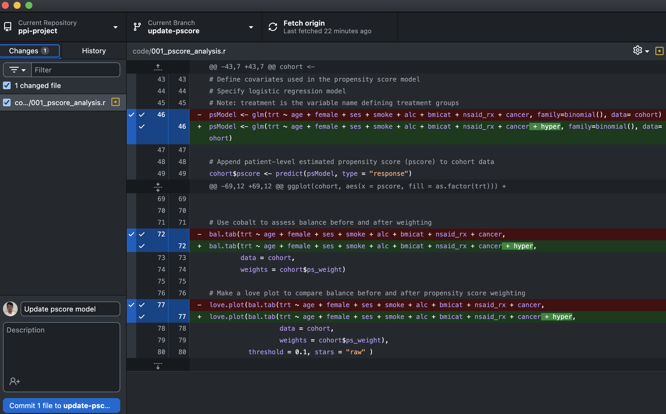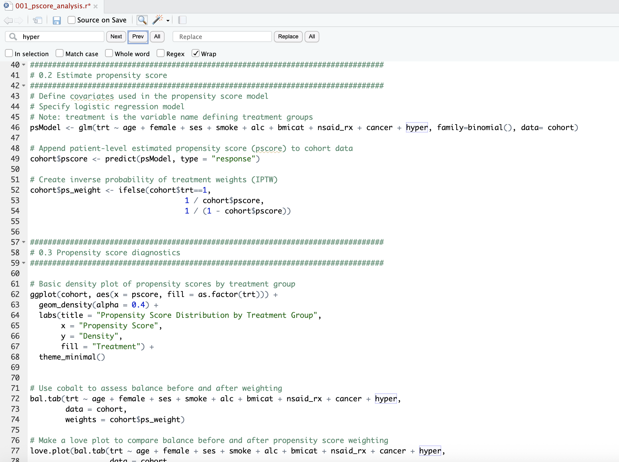 We need to add the hypertension variable (i.e. ‘+ hyper’) to our propensity score model and model diagnostics (Lines 46, 72, 77).