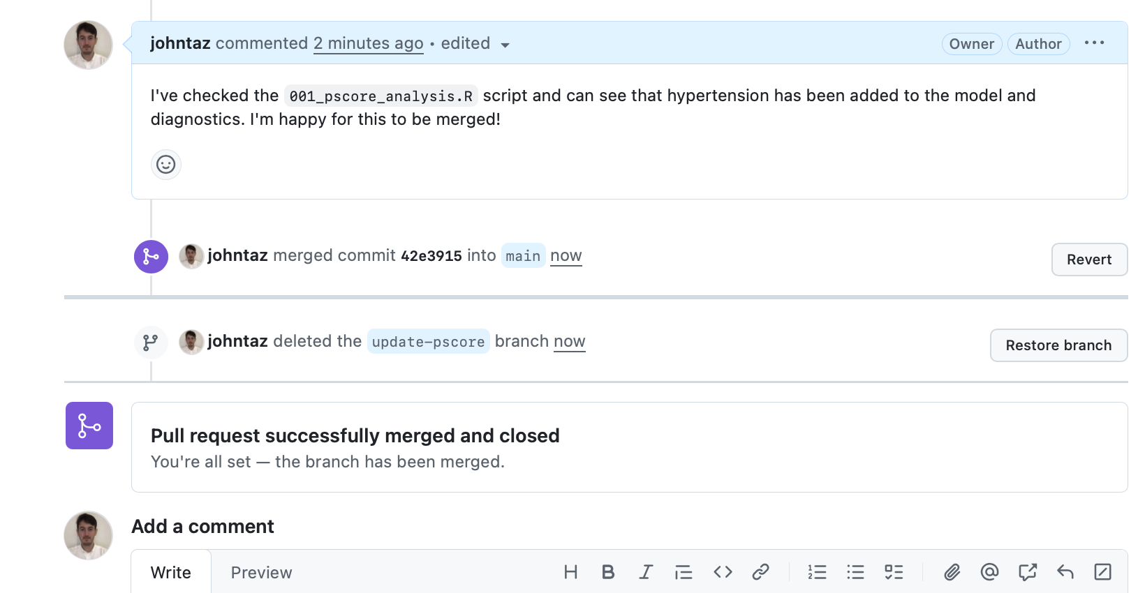 - We can see confirmation that this branch has been merged into main and can now safely delete the ‘update-pscore’ branch.
