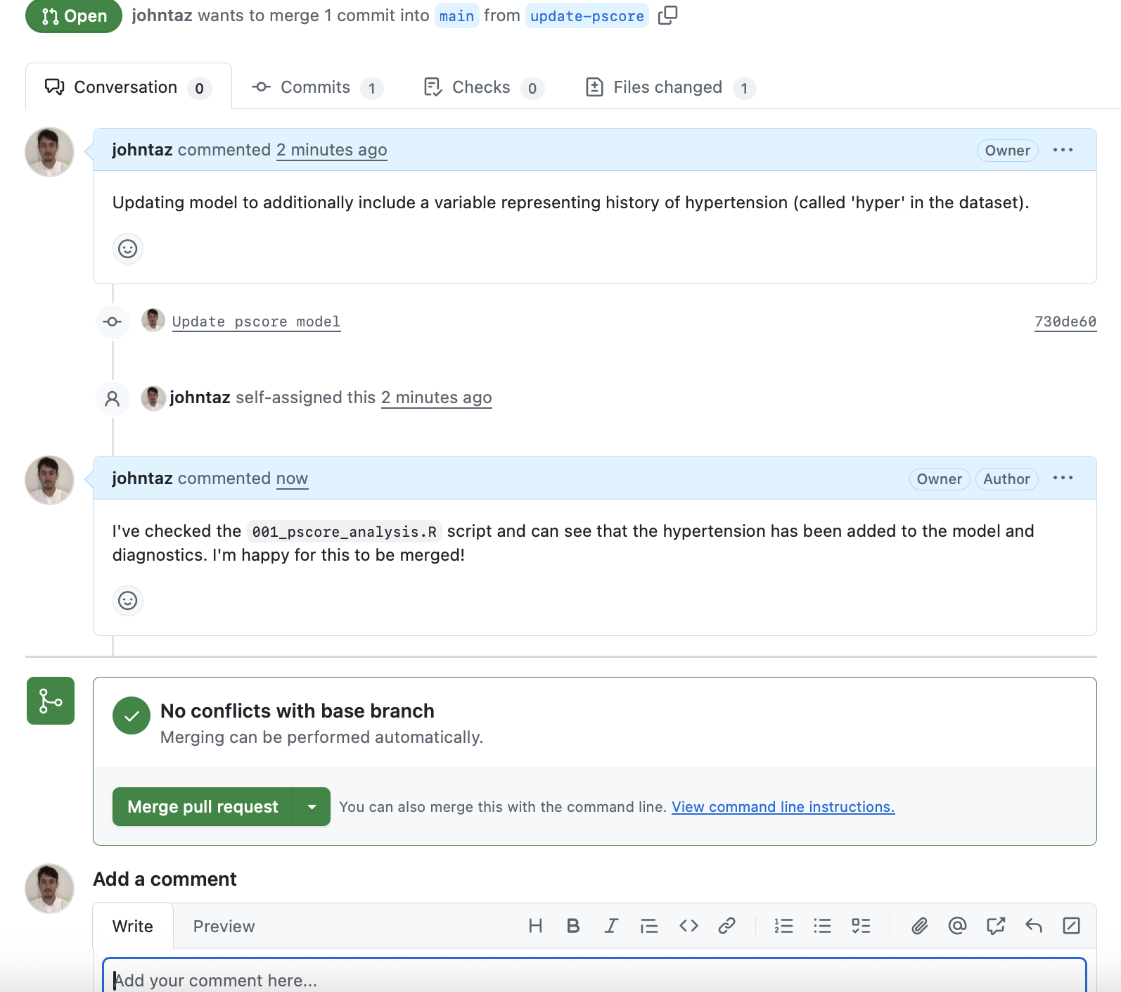 - Before merging, a reviewer would typically comment on the suitability of merging the proposed code. In this case, the changes are minimal and quick to check, therefore a comment as below may be added.