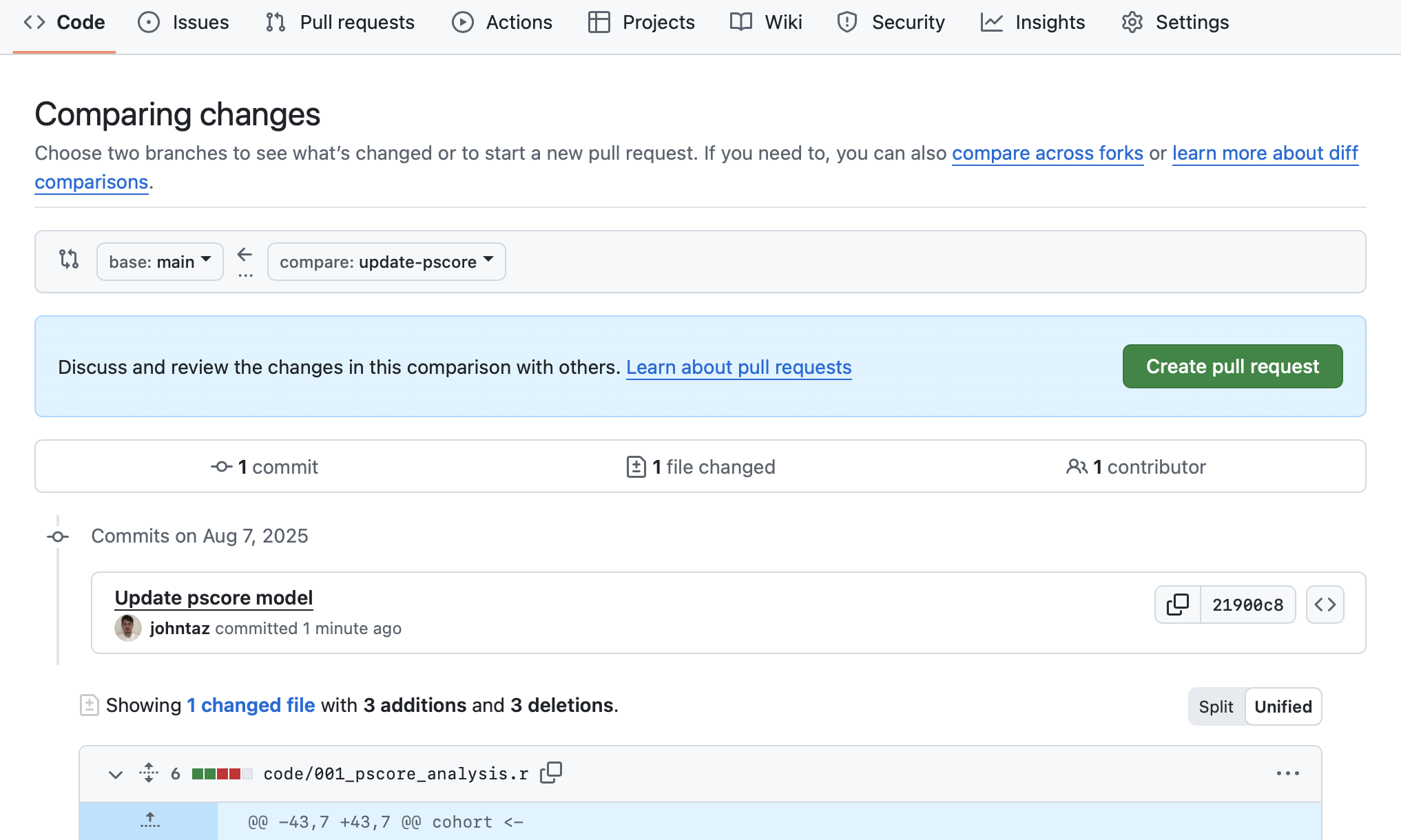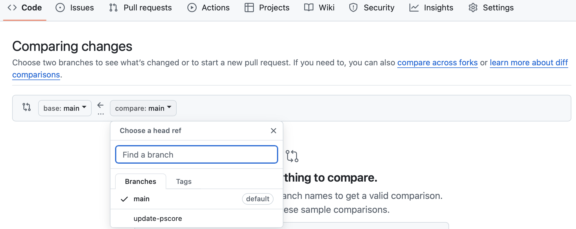 - We want to compare the ‘main’ branch to our ‘update-pscore’ branch. Select ‘update-pscore’ brnach from the ‘compare’ drop-down menu.