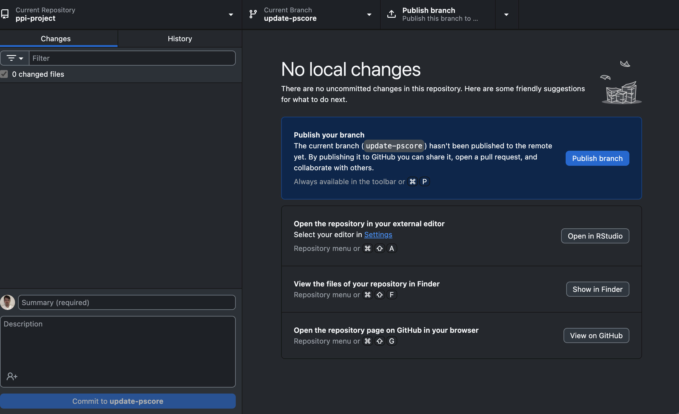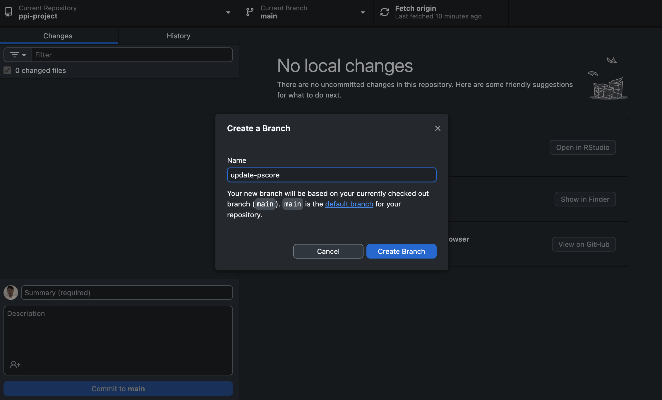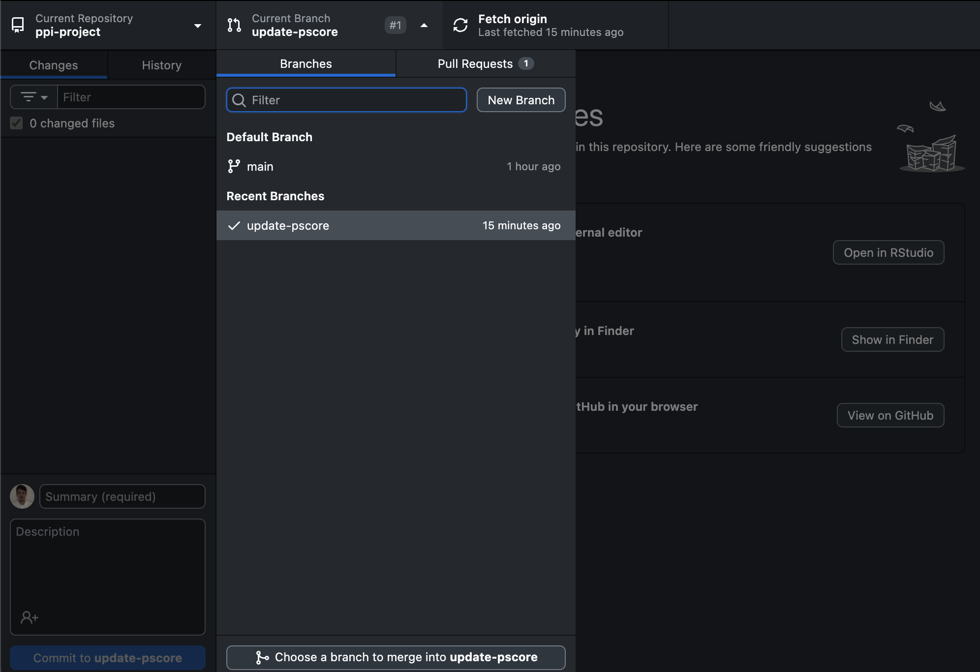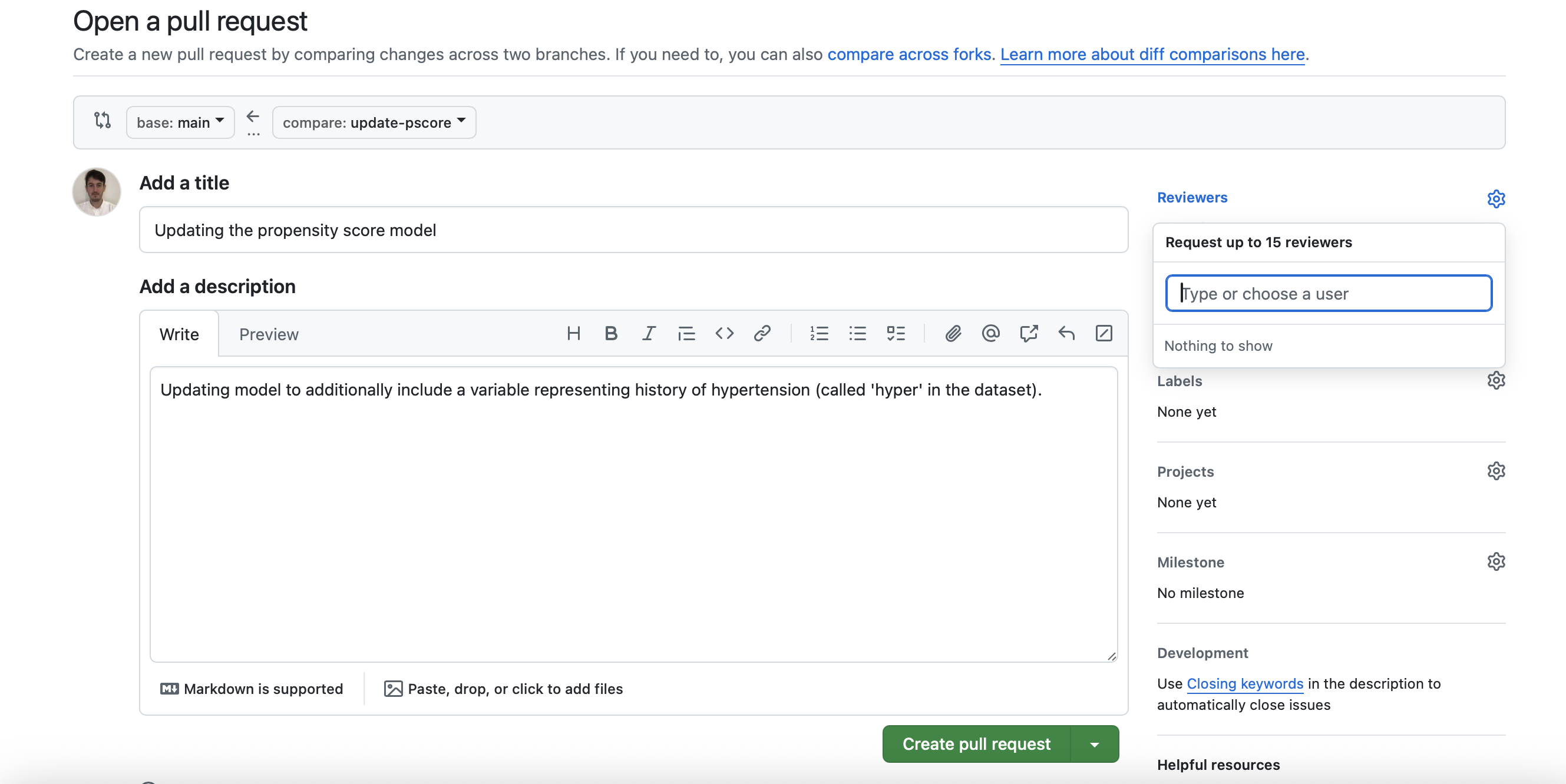 5. Add a ‘Commit message’, e.g. ‘Update pscore model’. Click ‘Commit to update-pscore’.
