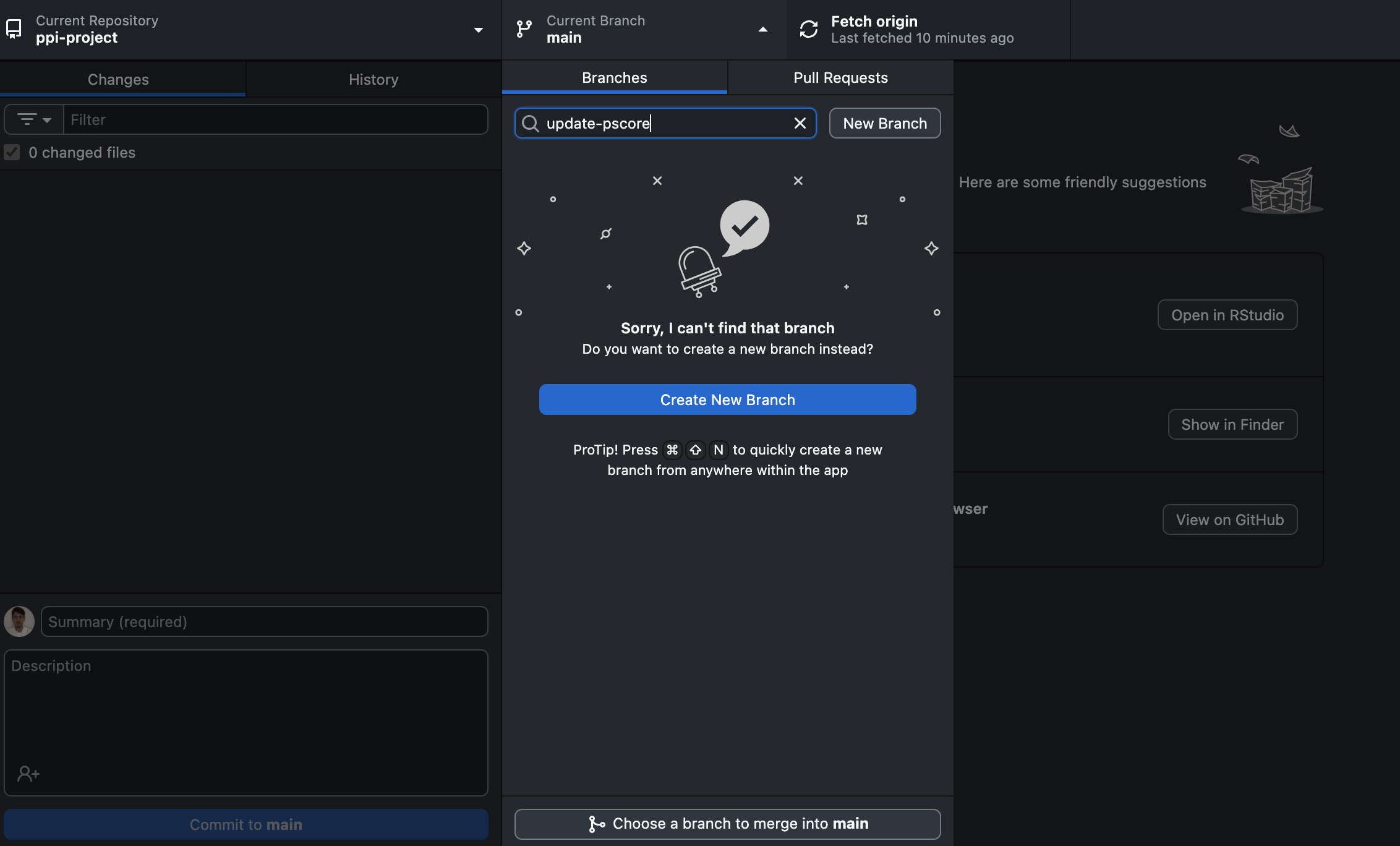 To update this file, we’re going to first create a Branch. Click the ‘Current Branch’ tab within the repository bar and add a name for the Branch e.g. ‘update-pscore’. Click ‘New Branch’