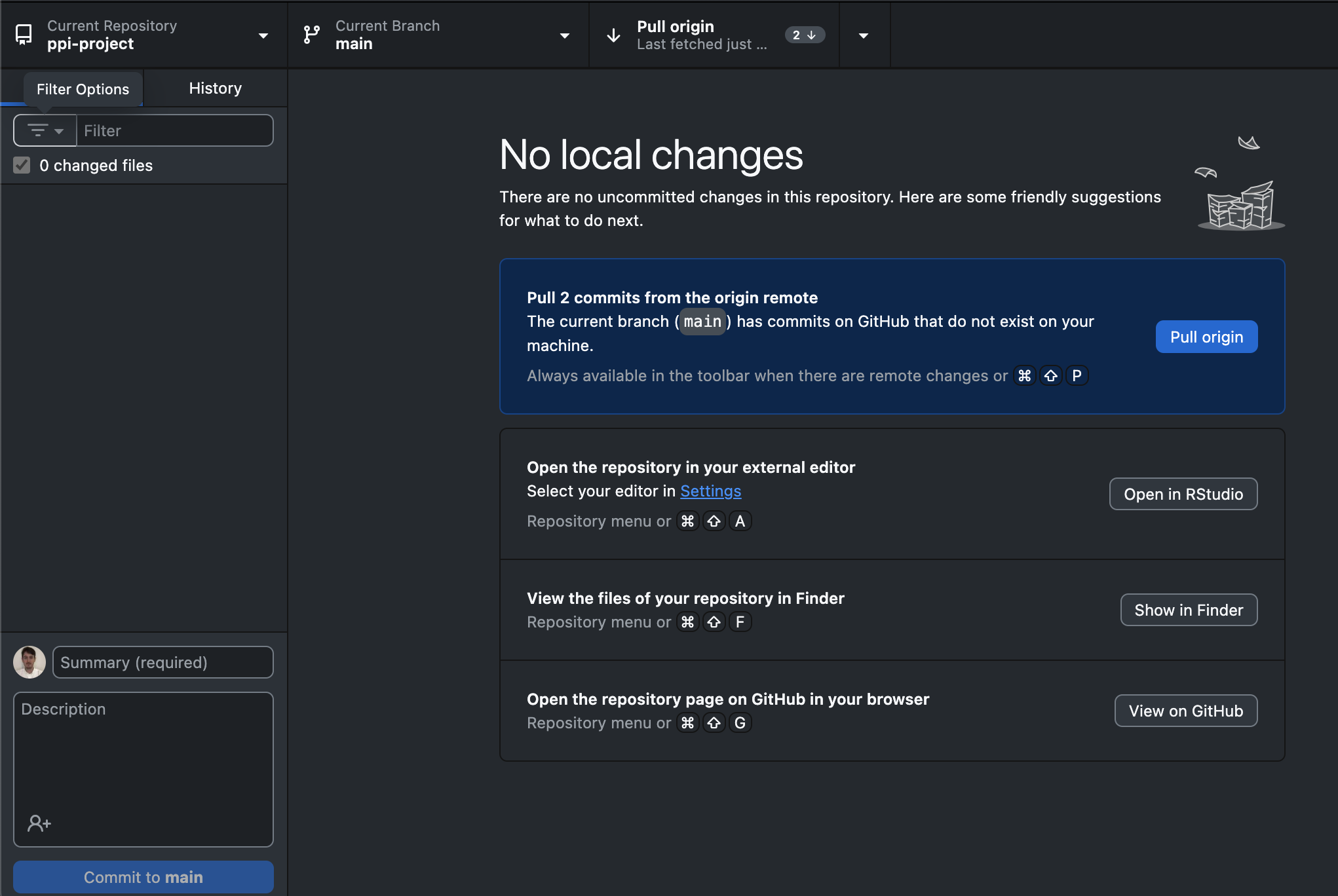 Return to GitHub Desktop and click ‘Fetch origin’ (nothing should happen if the files are up-to-date, but this is a good habit!).