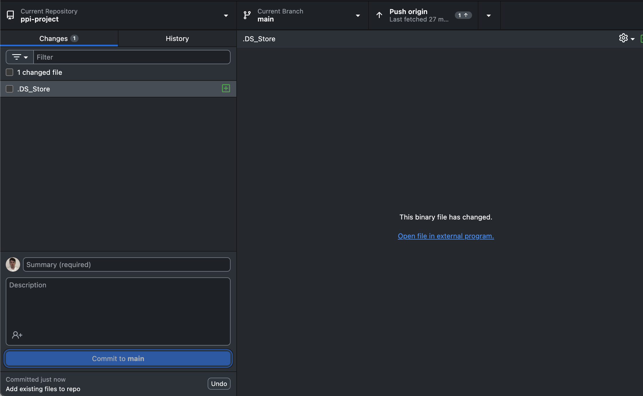 - Add a ‘Commit’ message e.g. “Add existing files to repo”. Click ‘Commit to main’.