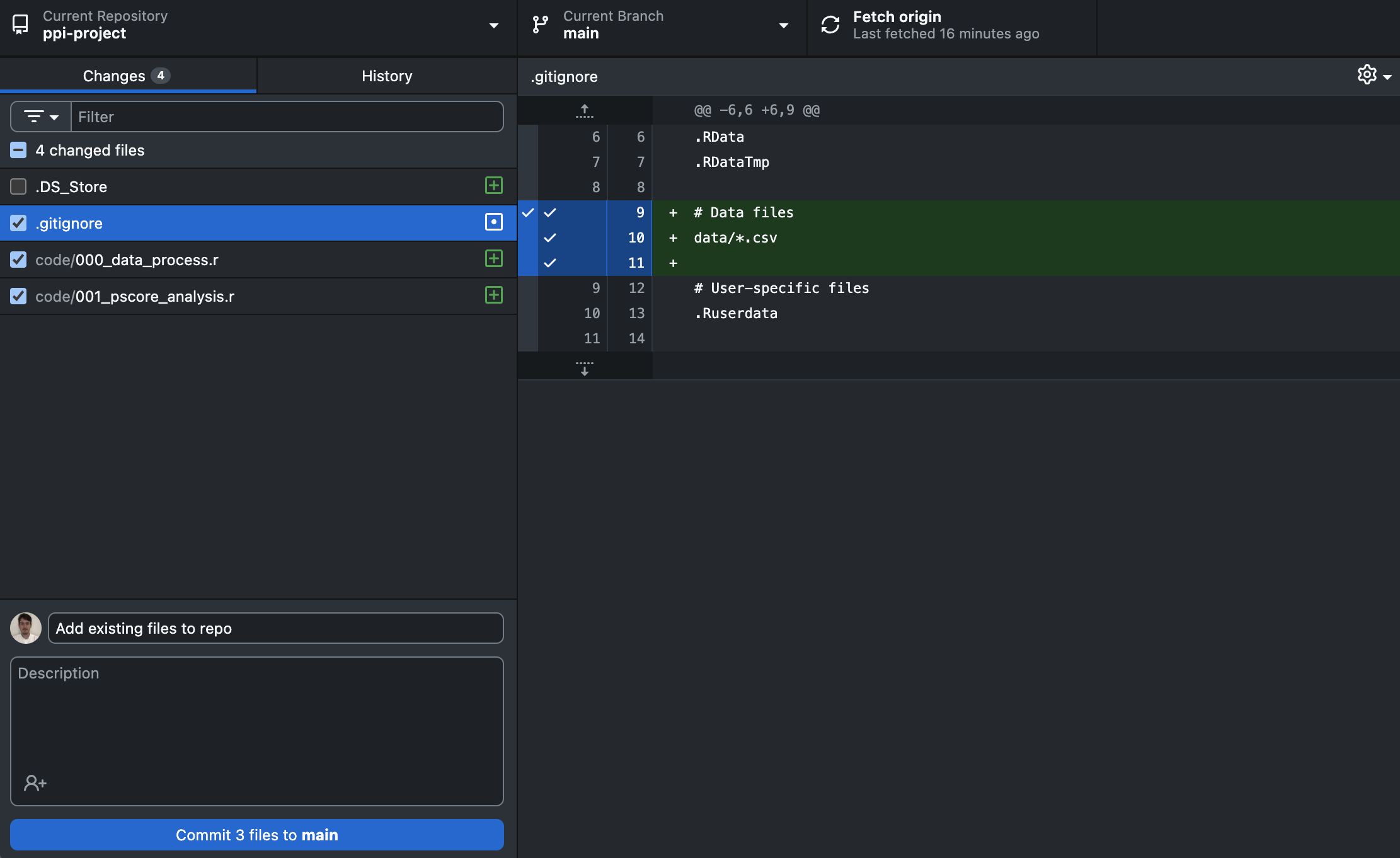 - In this case, we’re using fully simulated and are happy for this to be on GitHub.com. However, usually when working with data from a healthcare database we would not want to upload this to GitHub! One way of avoiding this is to add a folder and/or specific file type to our ‘.gitignore’ file - this stops files meeting these criteria being upload. See below, we’ve added a line to the ‘.gitignore’ file - how has this changed the files we had staged?