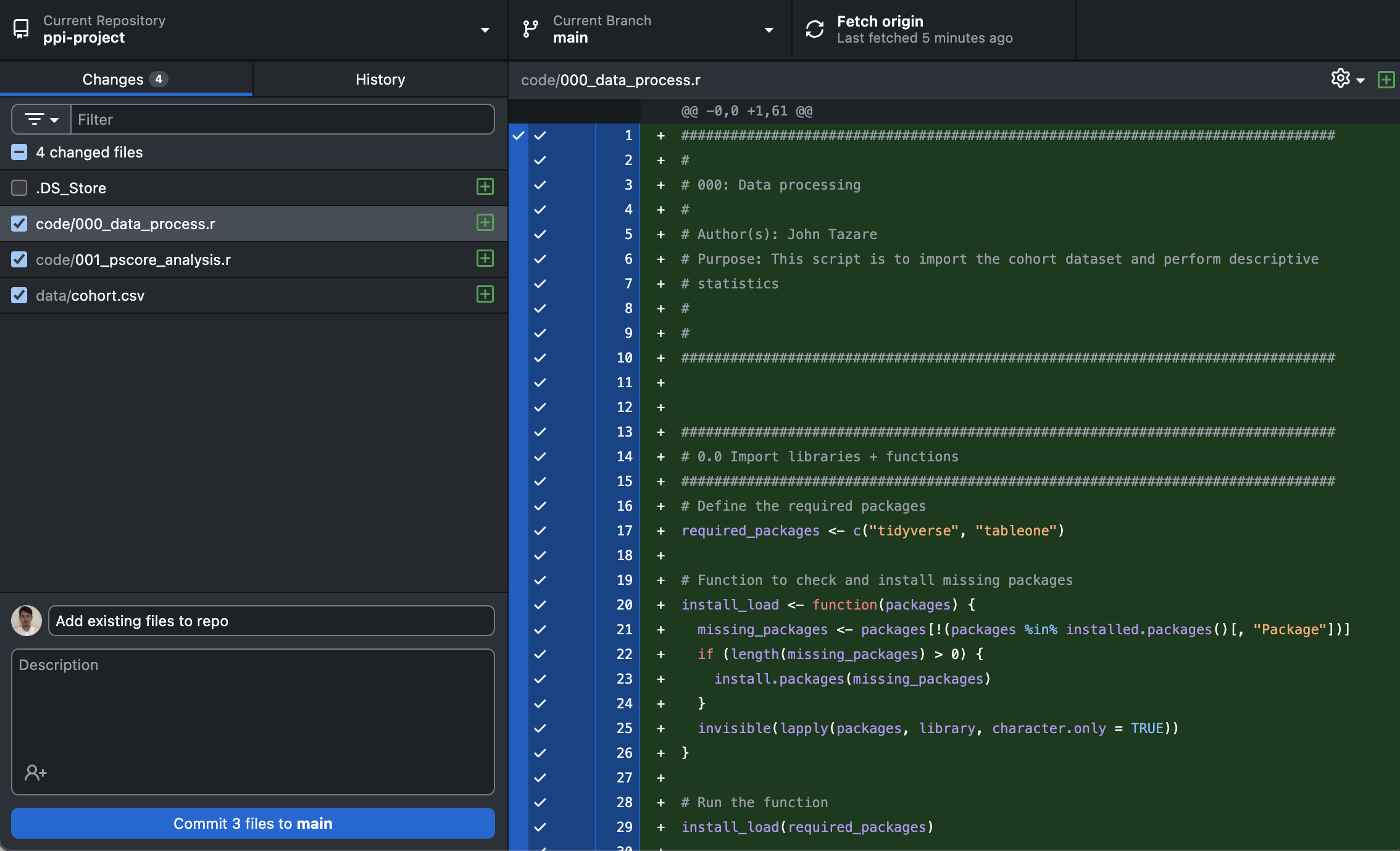 - Return to GitHub Desktop. You should now see the code files in the ‘Change Files’ window. Make sure these are ticked, the ‘ticking’ indicates the files are staged.