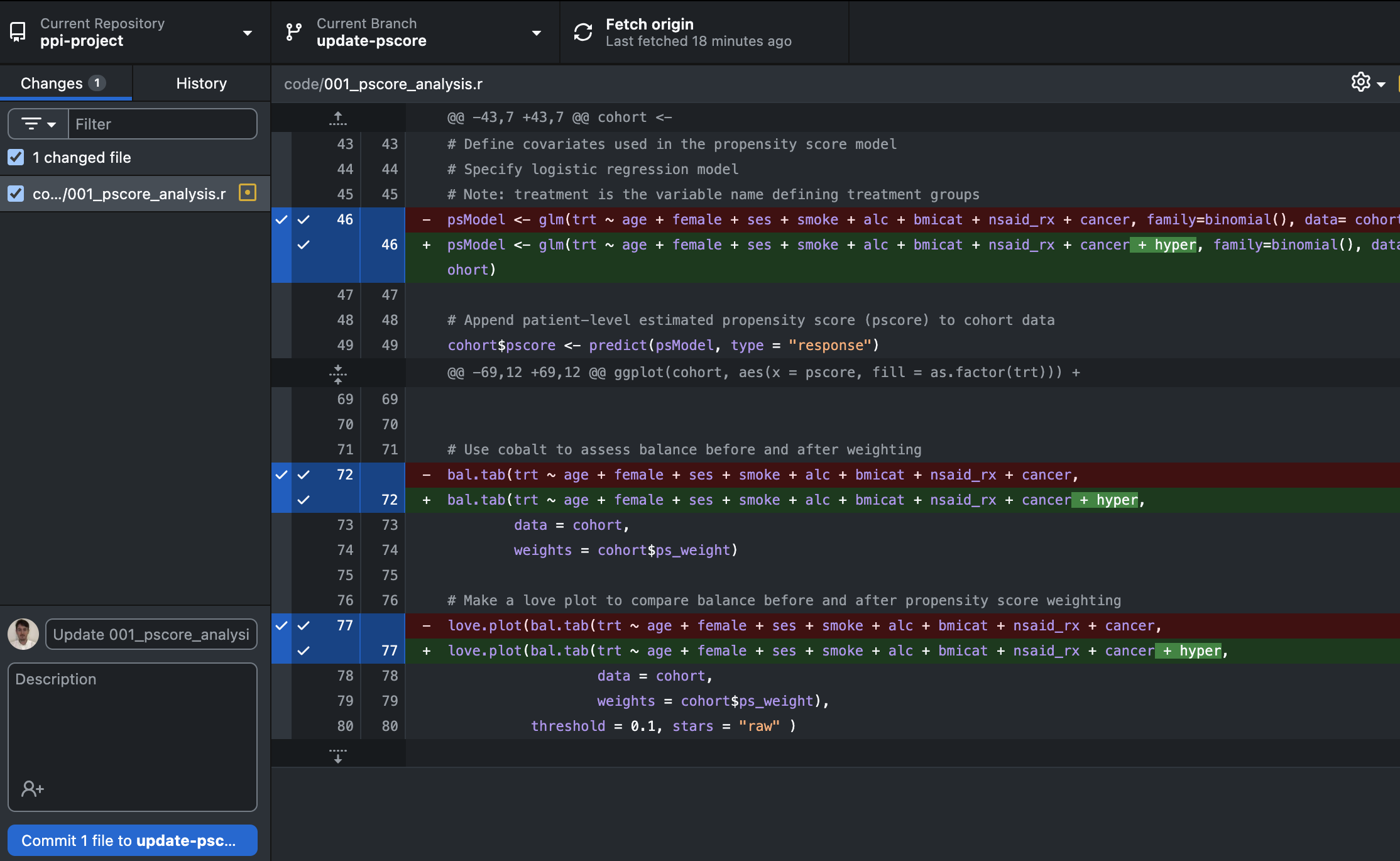 Navigate to your local repository. Open the ‘code’ subfolder and then open the ‘001_pscore_analysis.R’ file either in R Studio or any text editor available (Notepad, TextEdit, Visual Studio etc).